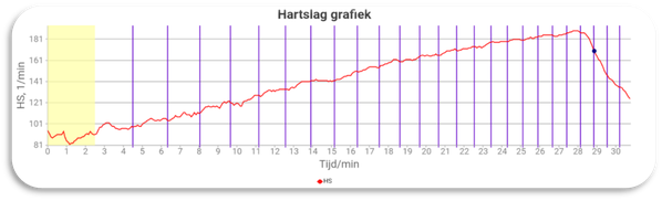 Met behulp van het MyVitality Testsoftware Pakket worden de hartslagwaarden die tijdens de test verzameld werden uitgezet in een grafiek (Hartslag grafiek) waarbij de verticale as de hartslag weergeeft en de horizontale as het belastingsverloop tijdens de test.